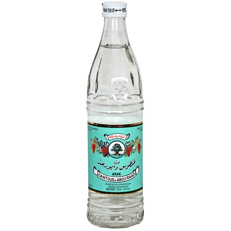 Arak Gantous & Abou Raad, Lebanon's best-selling triple-distilled arak with a signature yellow and red label, available for delivery in Amman.