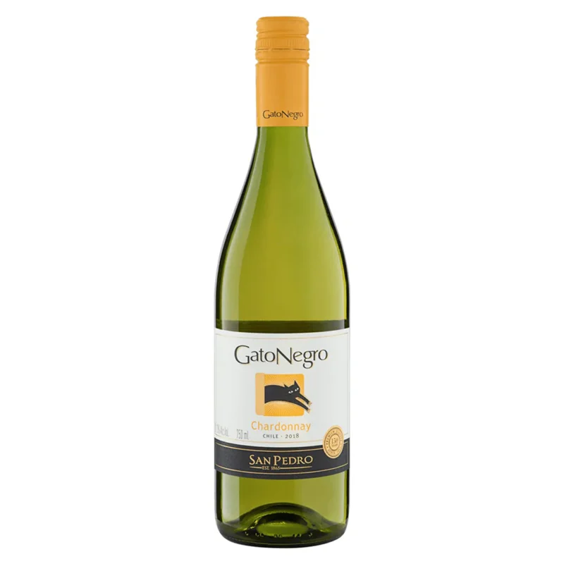 Gato Negro Chardonnay, featuring its pale yellow liquid and iconic black cat label, available for delivery in Amman.